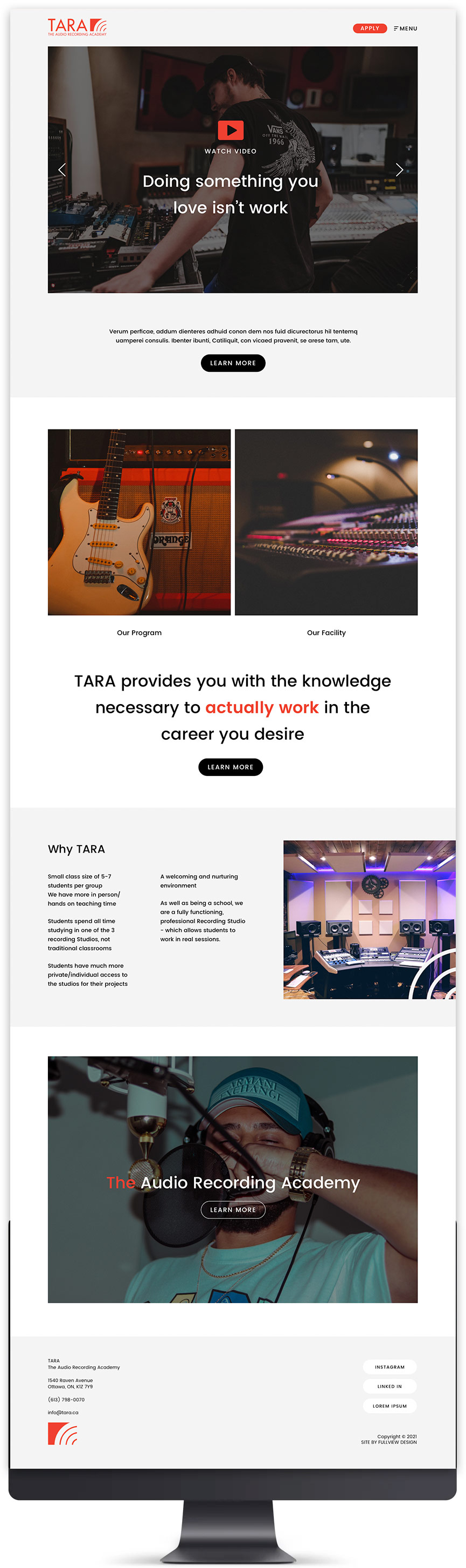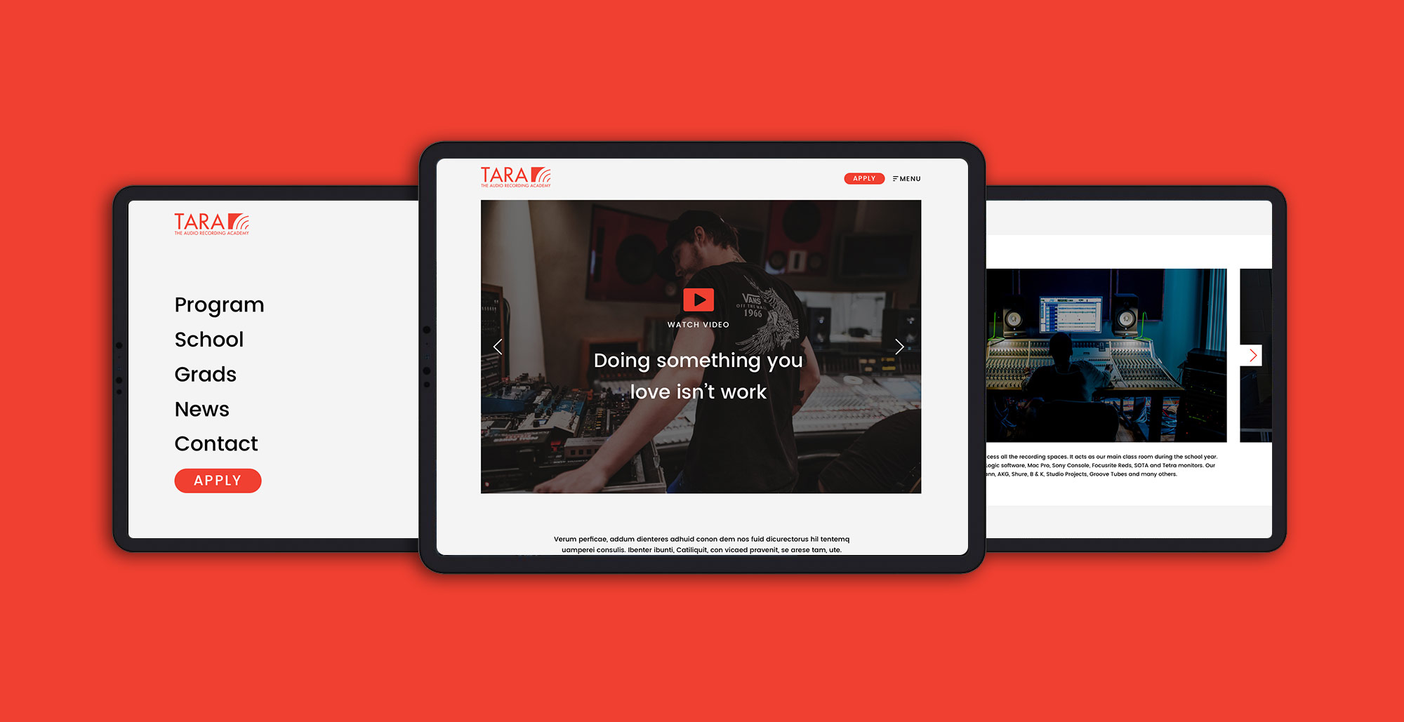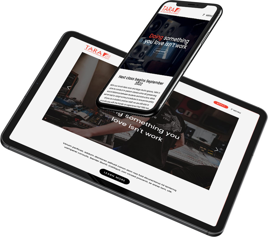Web site design and development for The Audio Recording Academy. The TARA website has a clean and simple appearance, with use of large imagery and jQuery functionality for subtle interactivity. The web site is used as a valuable lead generation tool for TARA with Search Engine Optimization implementation strategies and provides valuable information about the studio and what their academy has to offer.